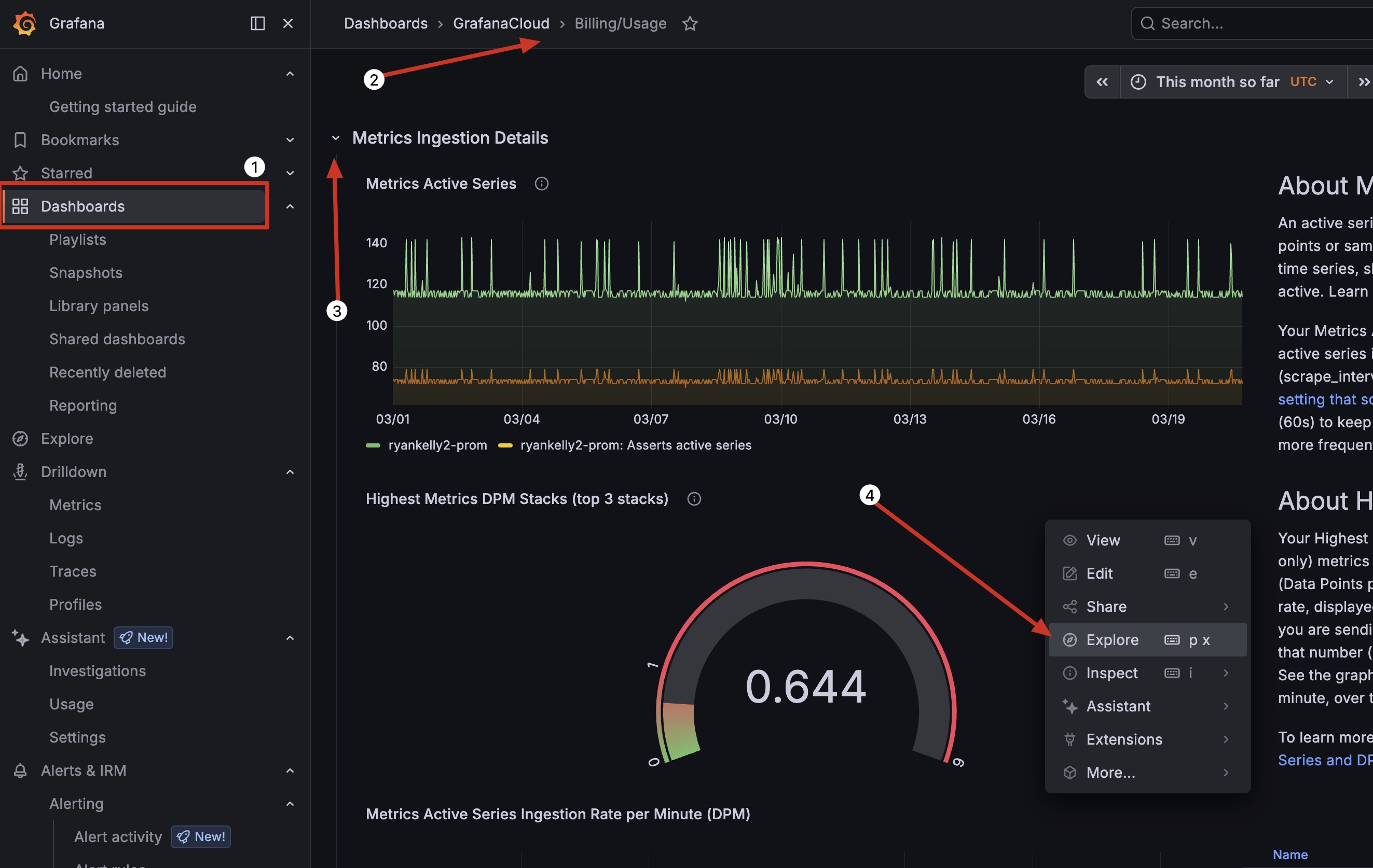 Login to your cloud stack and navigate to your Billing Dashboard, expand Metrics ingestion details, then click 3 dots on the Highest Metrics DPM Panel and click explore