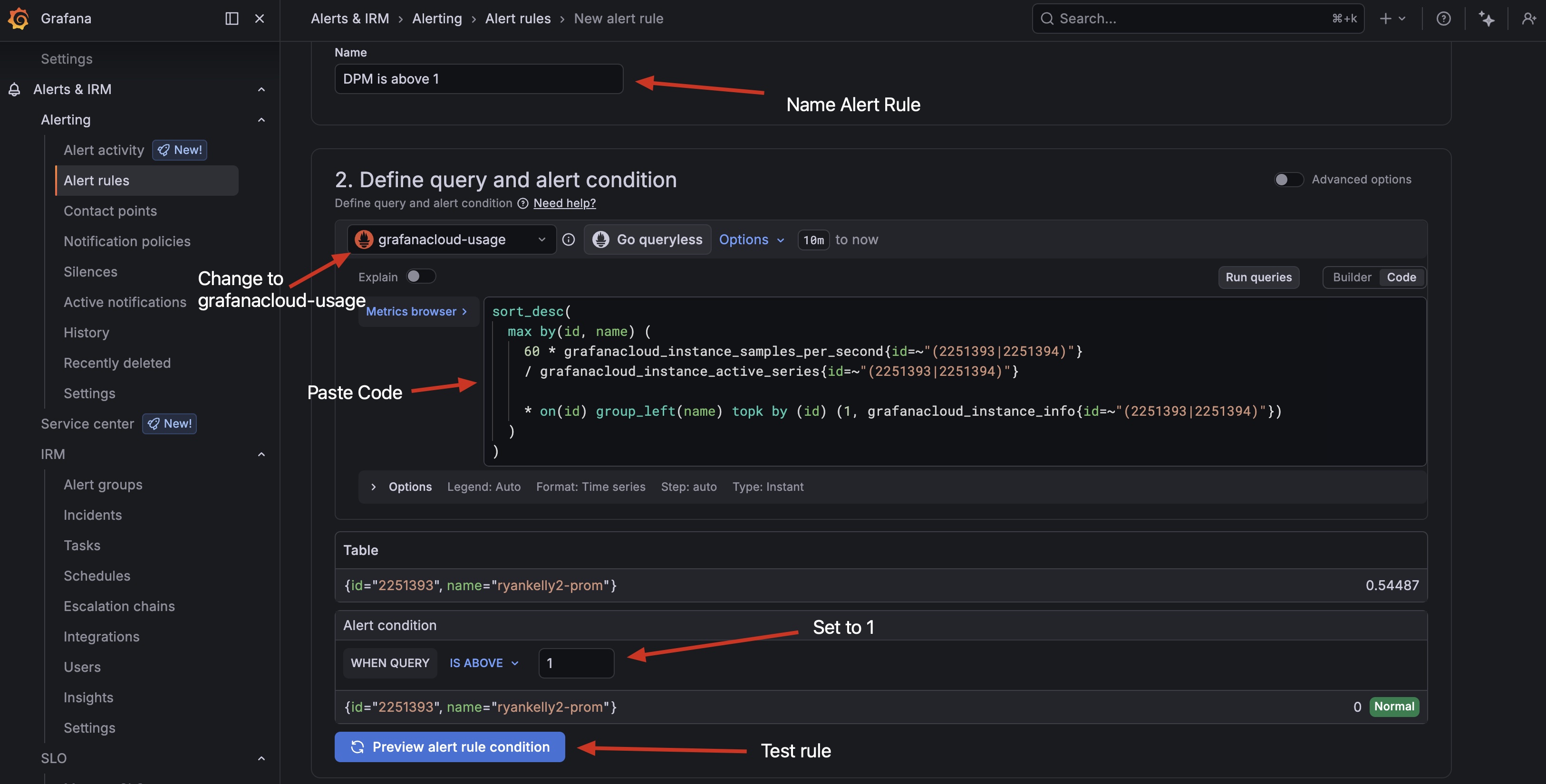 Name the alert rule, change datasource to cloud usage, paste the query code you copied earlier and set the rule to 1 and test it