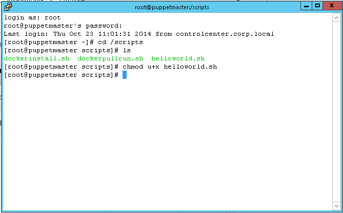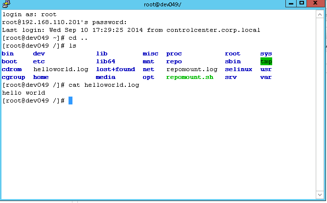 Almost there, now we will need to create a test script on our repo server. I have setup a Linux server and I exported a directory named scripts as a read only NFS share. In that directory create a file named helloworld.sh with the following and save it.