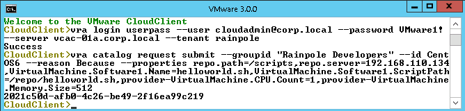 vra catalog request submit --groupid "Rainpole Developers" --id CentOS6 --reason Because --properties repo.path=/scripts,repo.server=192.168.110.134,VirtualMachine.Software1.Name=helloworld.sh,VirtualMachine.Software1.ScriptPath=/repo/helloworld.sh,provider-VirtualMachine.CPU.Count=1,provider-VirtualMachine.Memory.Size=512