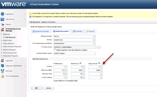 Remember way back in vCAC 5.2 days ; – ) how you could configure an approval at threshold for CPU’s, Memory, Storage and Lease days?