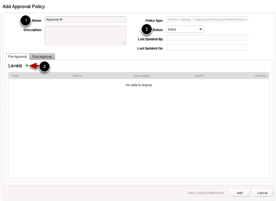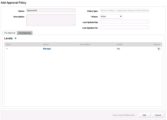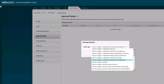 Now click add Approval Policy and select the Service Catalog – Catalog Item Request (Virtual Machine) and press ok