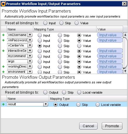 Select the following parameters to move to values in your workflow but make sure vCenterVm is and change Program path to mycommand and arguments to args. It should look like this.