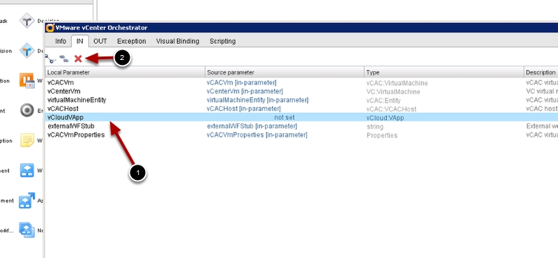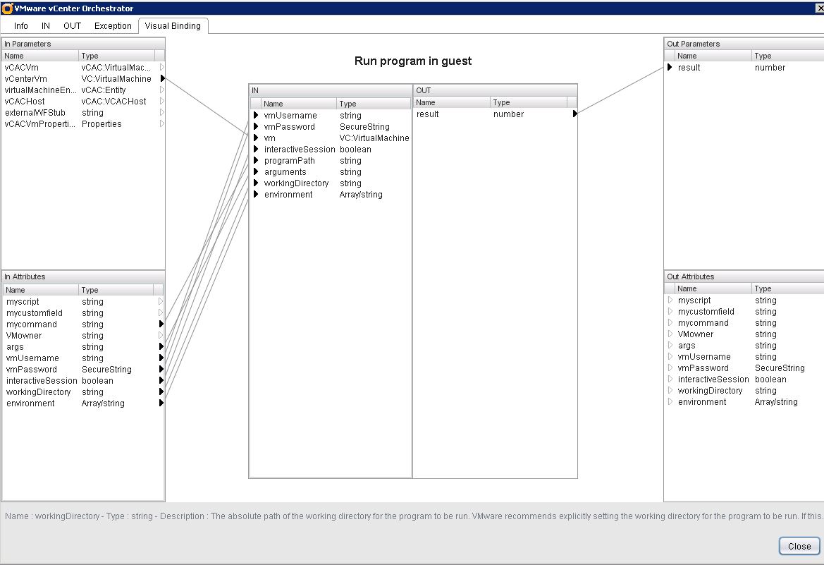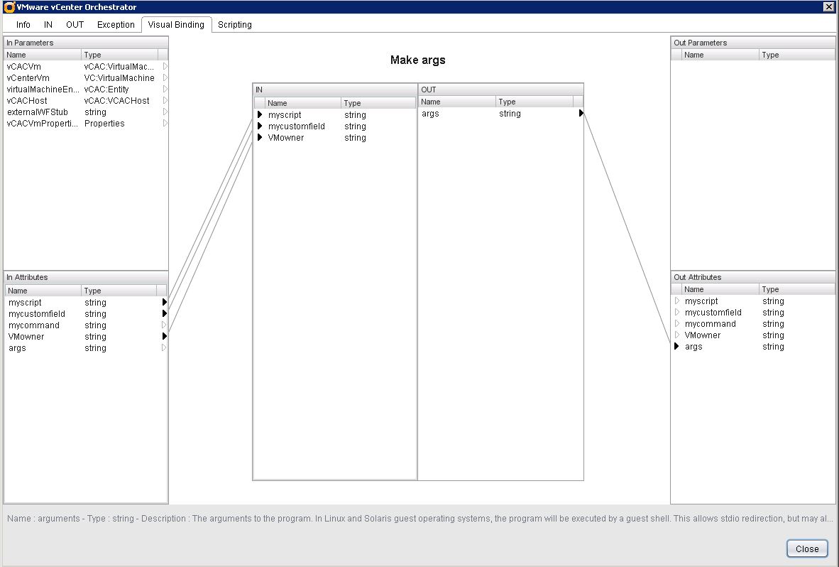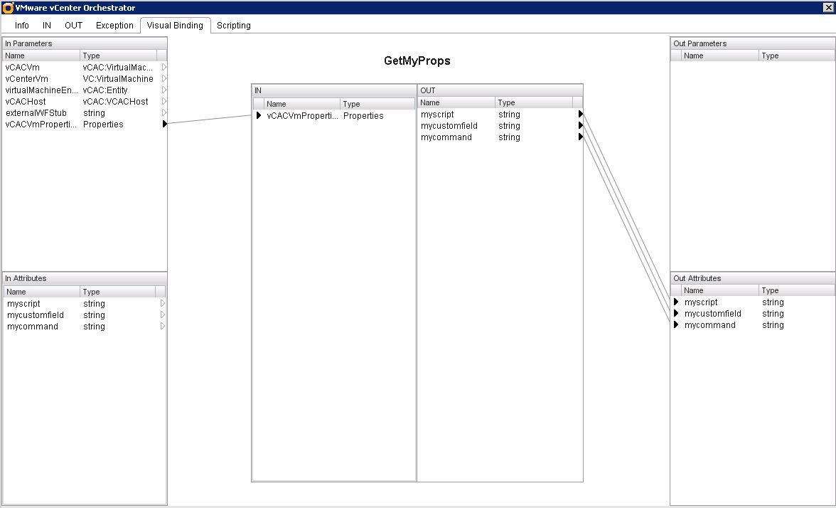 Now select the Visual Binding tab and drag the vCACvmProperties to the IN box so it looks like this: