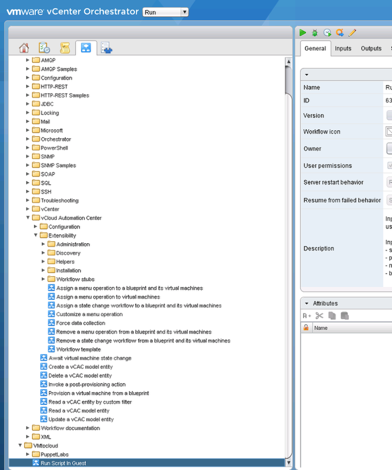 Now let’s go to the General tab and setup some of our attributes. You need to set the VMusername and VMPassword that the run program in guest will use as well as the polling rate and timeout that vCO will check if the VM tools is started. You also need to enter something for the working directory. / for Linix and C:\ for windows.