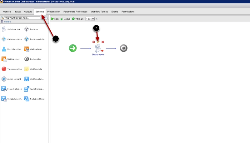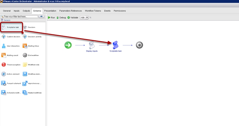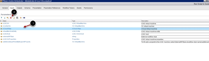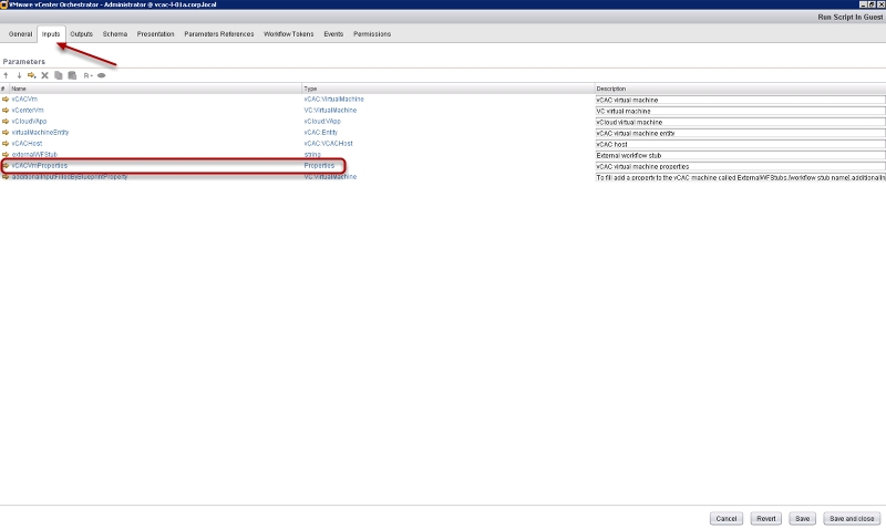 Click the inputs tab and you can see some of the parameters that are coming from vCAC. Notice the vCACVMProperties. This is where we are getting all the custom properties from.