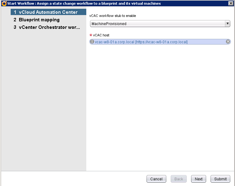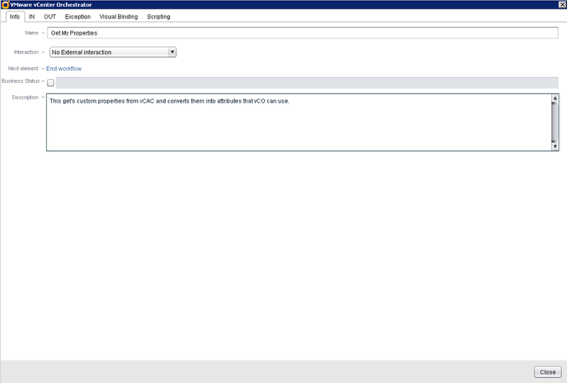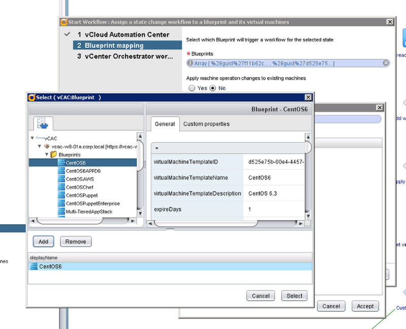 To use a vCO workflow with vCAC you need to start with special provided workflow and then build your workflow from that. This special workflow will get all the custom properties from the vCAC blueprint and make them available for you to work with in your work flow. The custom properties are more than what we added to the blueprint in the previous step. There are also out of the box properties that are already populated. You can see the complete list here. In this lesson I will use one of the out of the box properties and the ones we created to give you the full perspective.