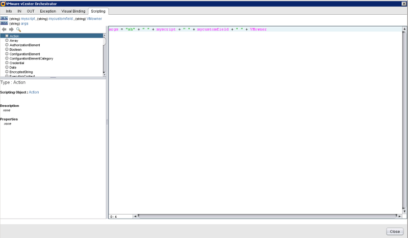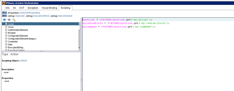 myscript = vCACVmProperties.get('my.script'); mycustomfield = vCACVmProperties.get('my.custom.field'); mycommand = vCACVmProperties.get('my.command');