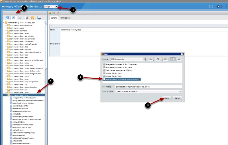 Login to vCO client and the first thing we will need to do is import an action courtesy of Tom Bonnano of @dailyhypervisor, download and unzip the file from the link below and then browse to the com.vmware.library.vcac folder and right click and import the action getVirtualMachineOwnerUsername