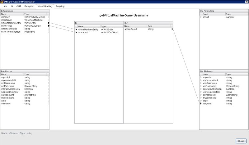 Now go back to the Schema Tab and click to edit the GetVirtualMachineOwner Action and go to the visual bindings tab and connect the following then close