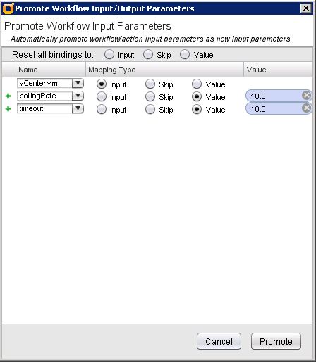 Next select the following for input Parameters and values for pollingRate and timeout and click Promote