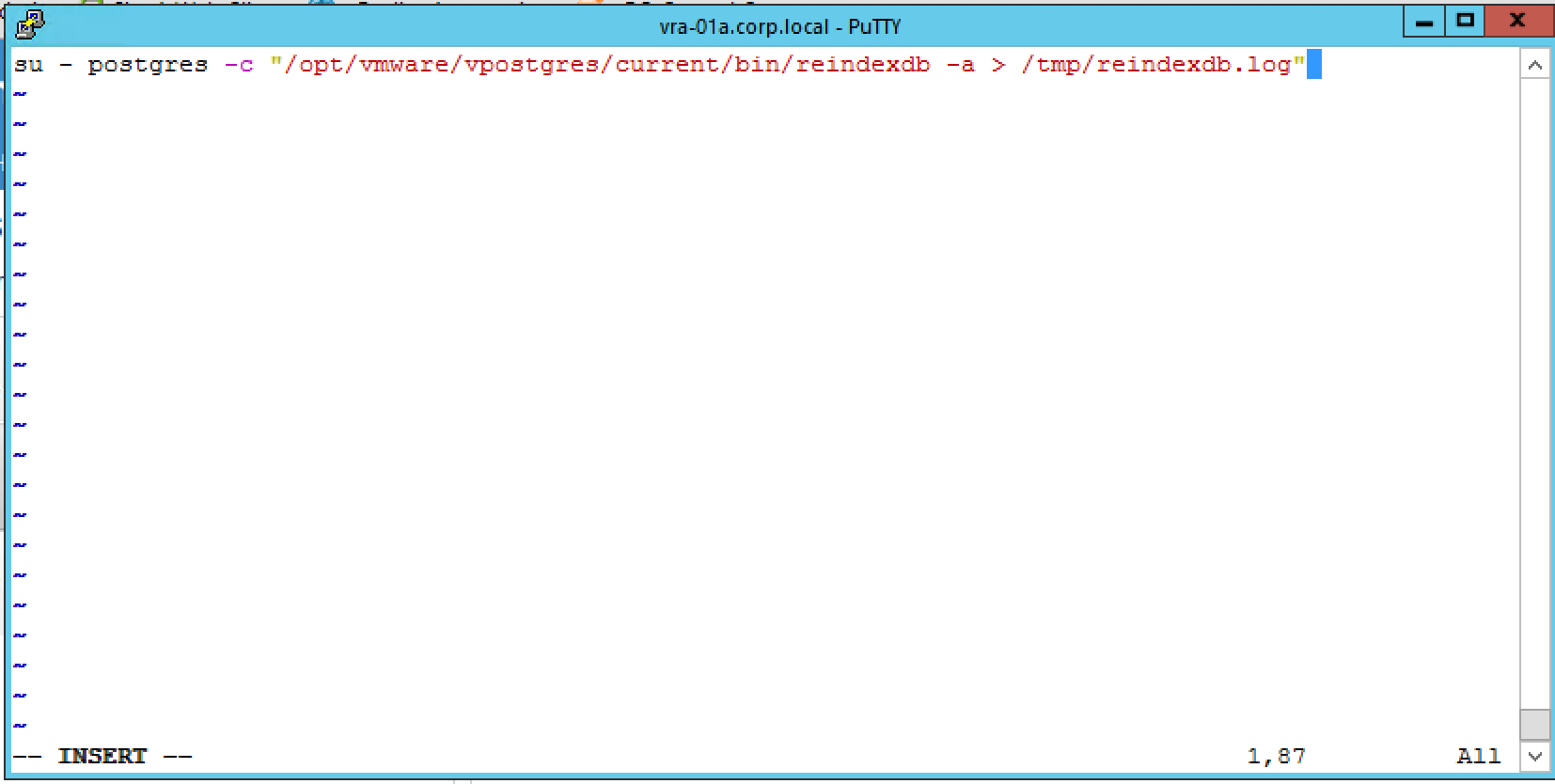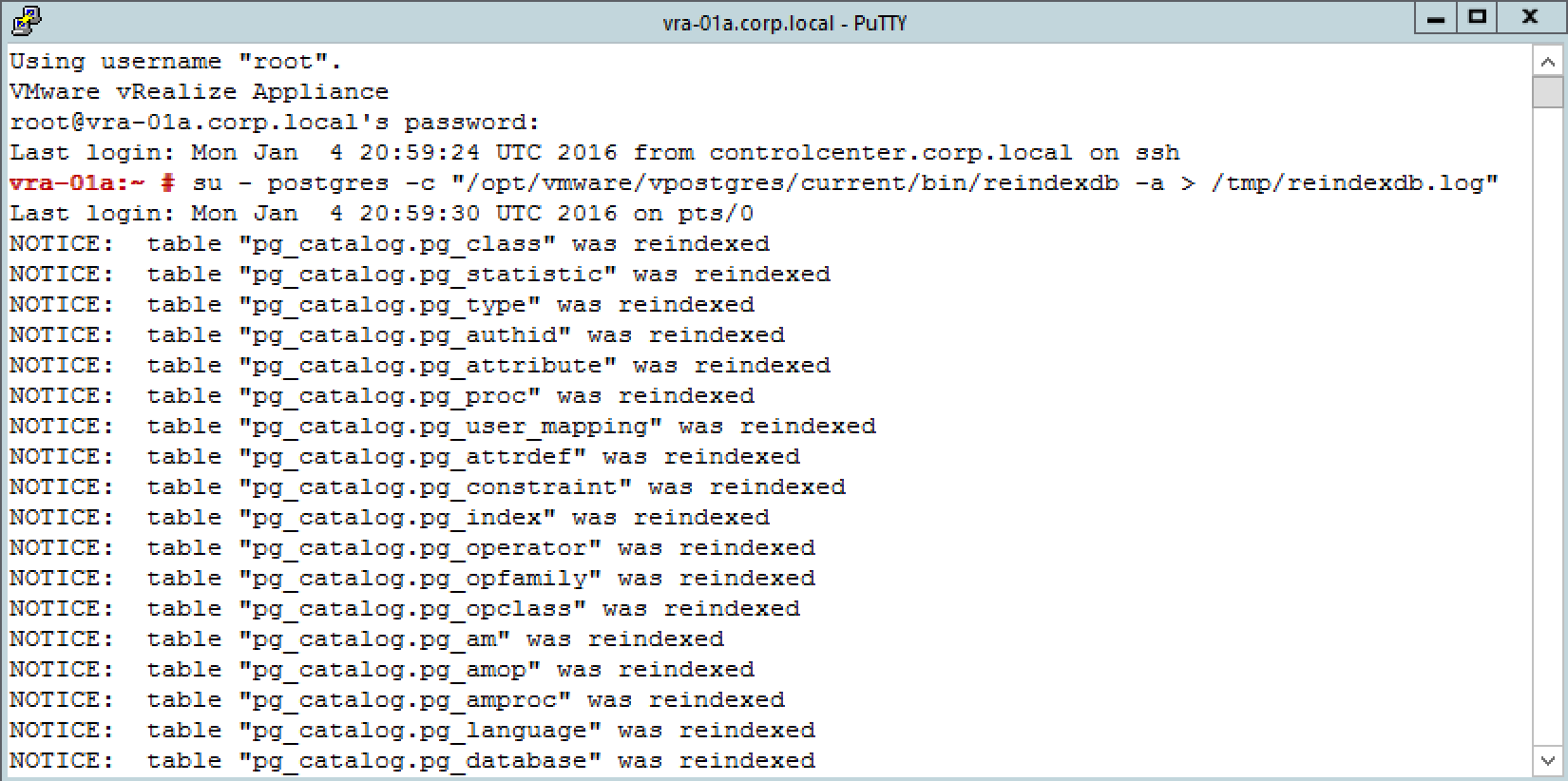 su - postgres -c "/opt/vmware/vpostgres/current/bin/reindexdb -a > /tmp/reindexdb.log"