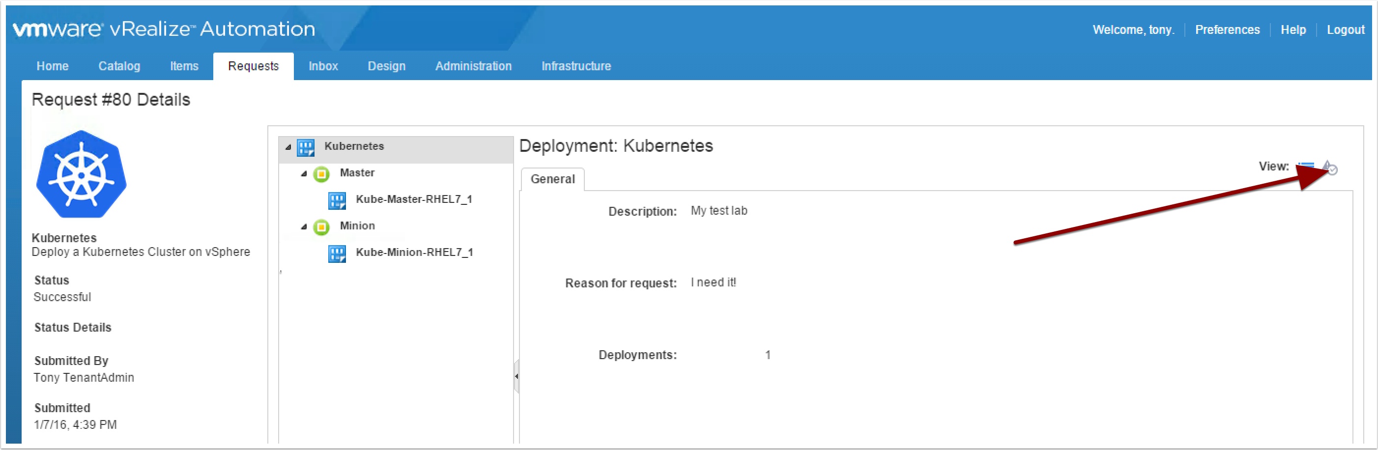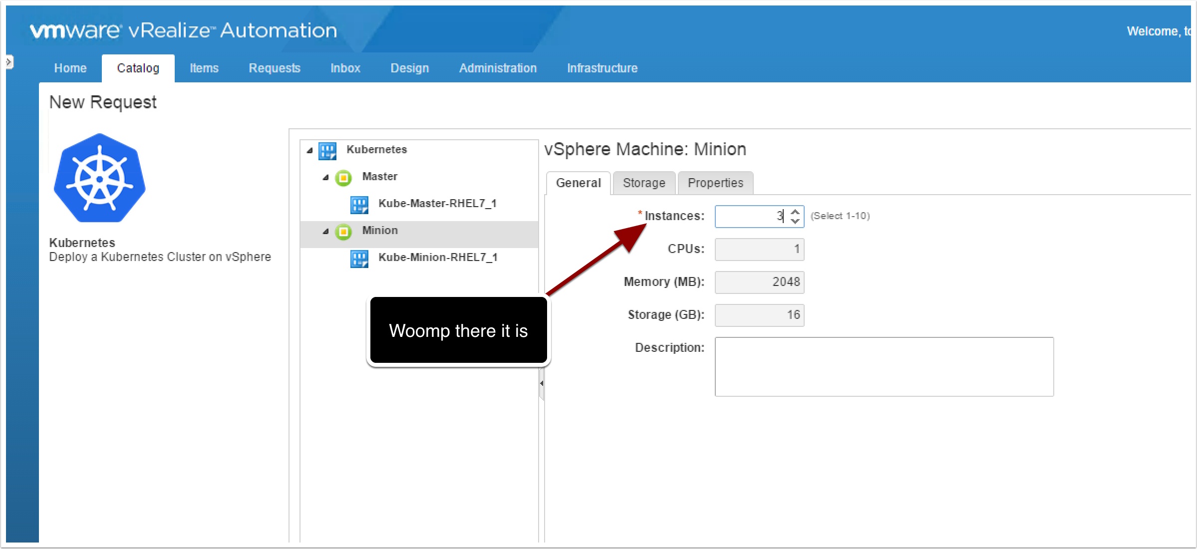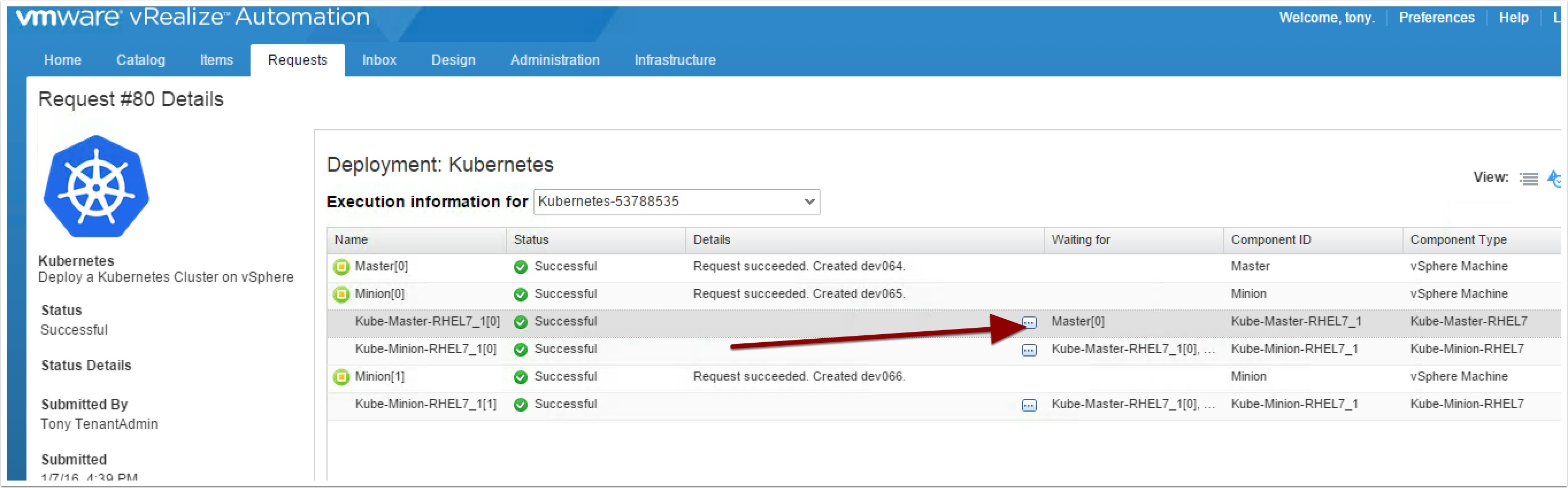 Nice blueprint ! One minor update is needed to the article though… After importing the blueprint, updating the VM Template and snapshot name, adding my network, one additional check was needed: it seems the Minion Kube-Minion-RHEL7_1 software component property “master_ip” was not set. My first deployment was successful, but there were nodes registered because they didn’t know their master_ip. After ticking the “Binding” box and adding the value _resource~Master~ip_address and saving, my next deployment successfully showed the nodes registered to the master.