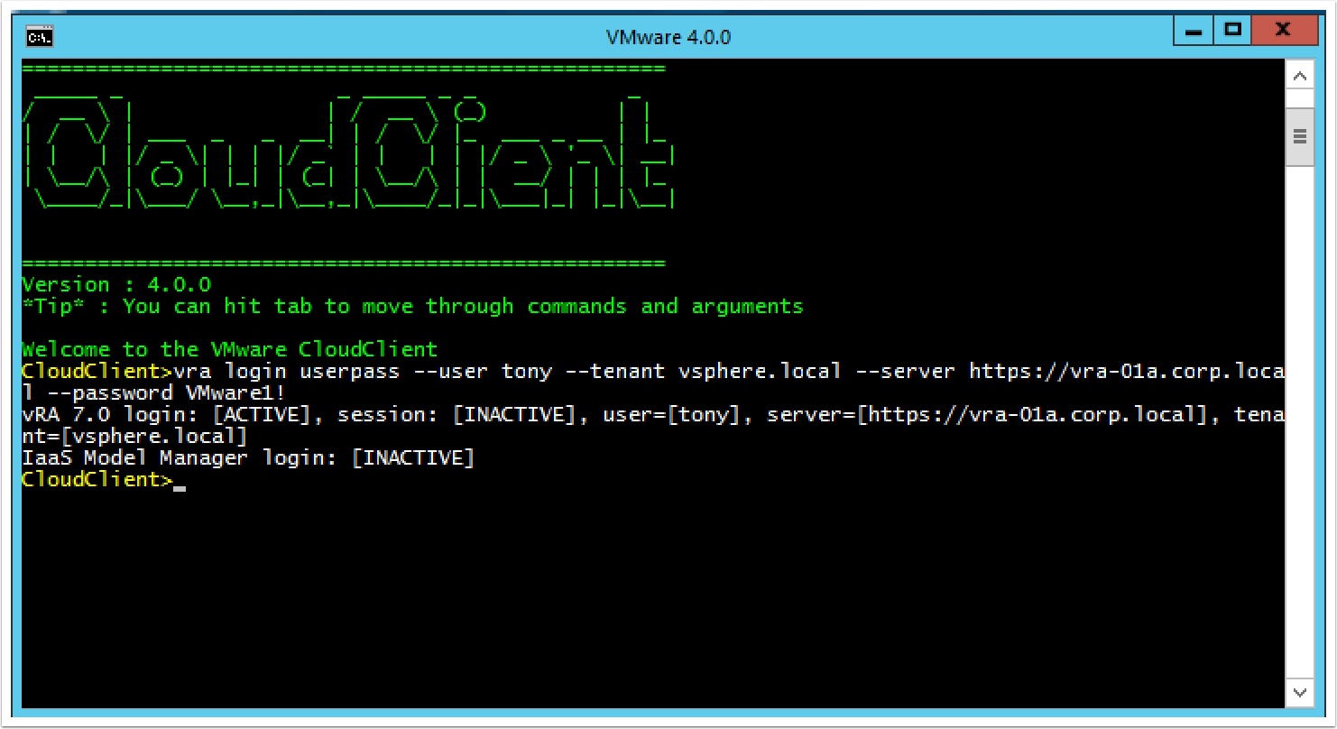 vra login userpass --user tony --tenant vsphere.local --server https://vra-01a.corp.local --password VMware1!