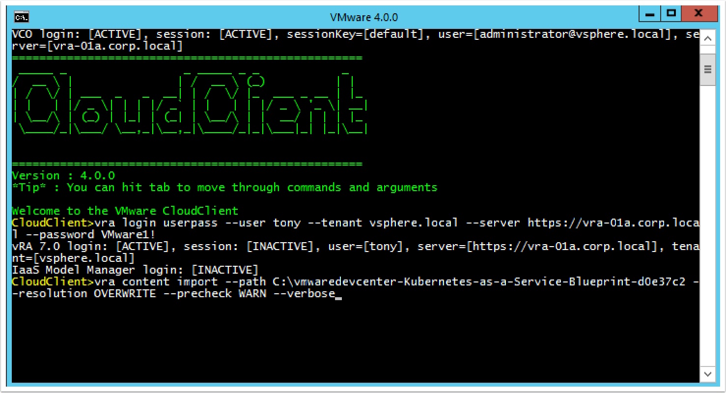 vra content import --path C:\Kubernetes-composite-blueprint.zip --resolution OVERWRITE --precheck WARN --verbose