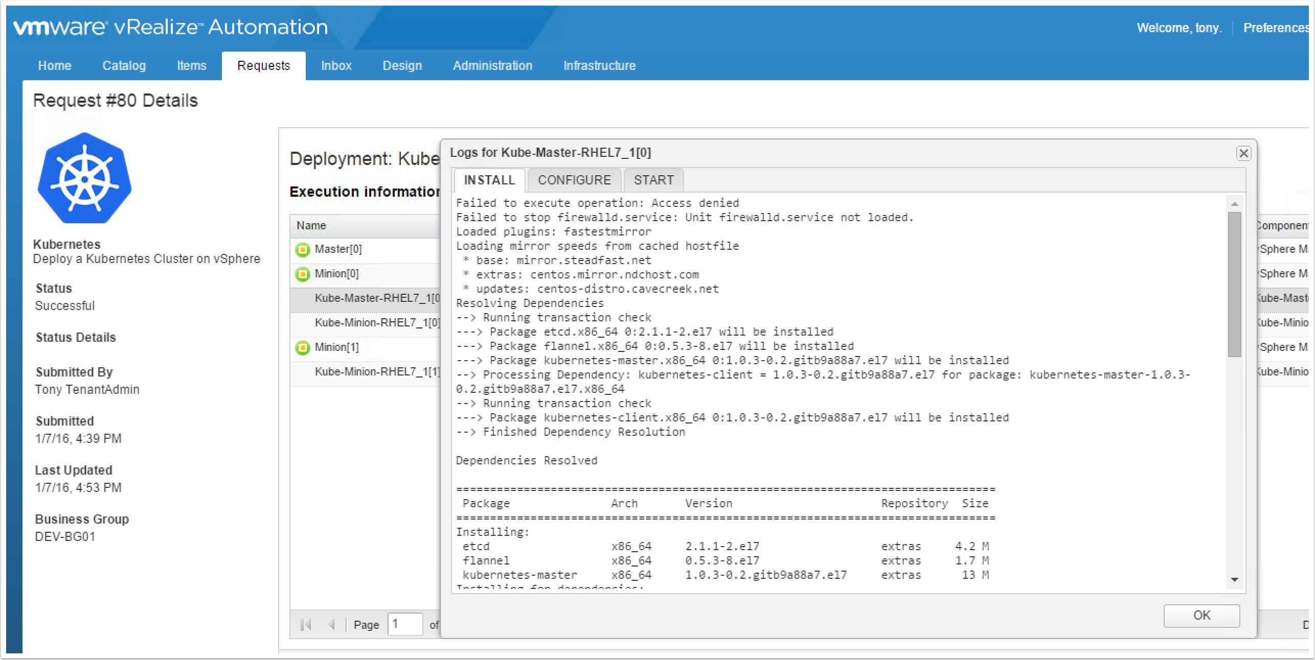 I then went to see the logs on the vRA request, and found an issue on the install and start logs: