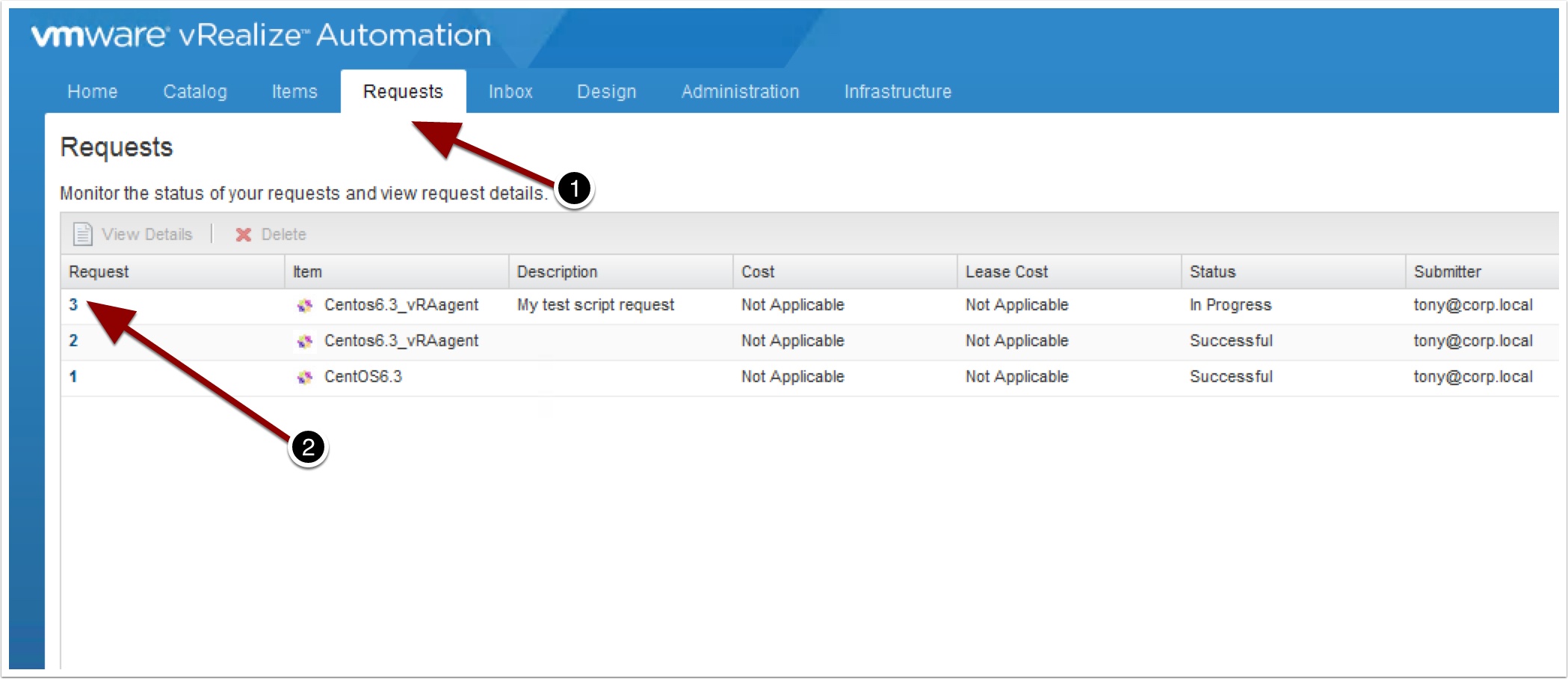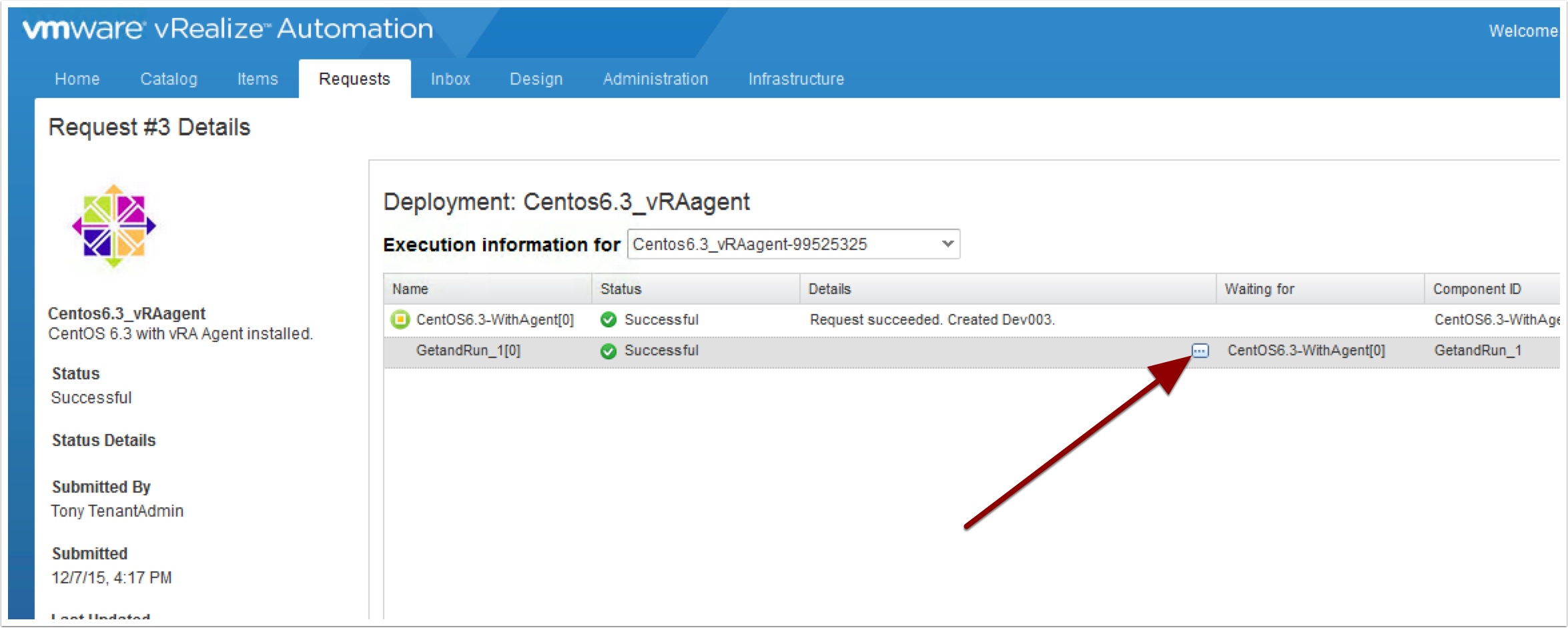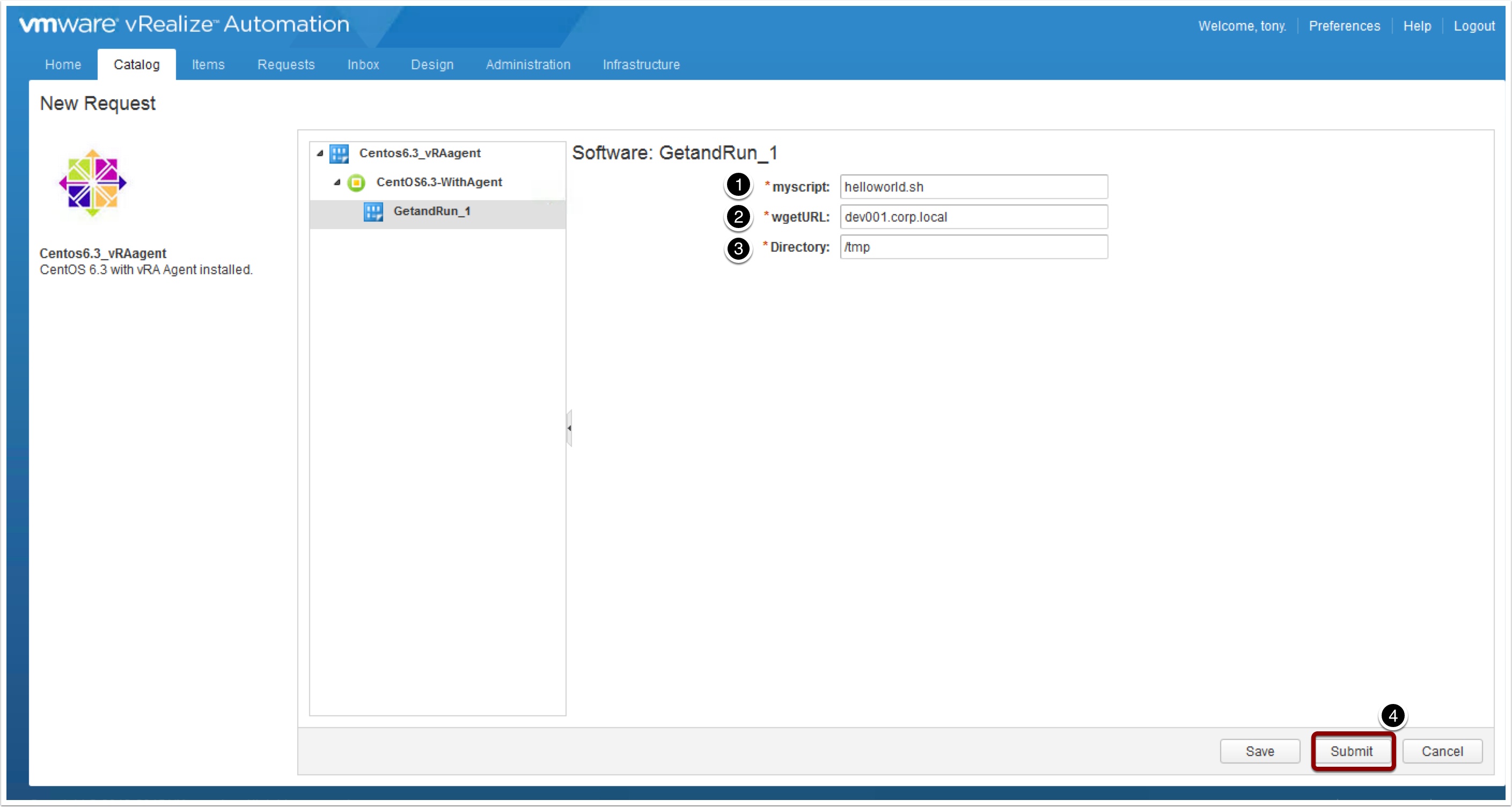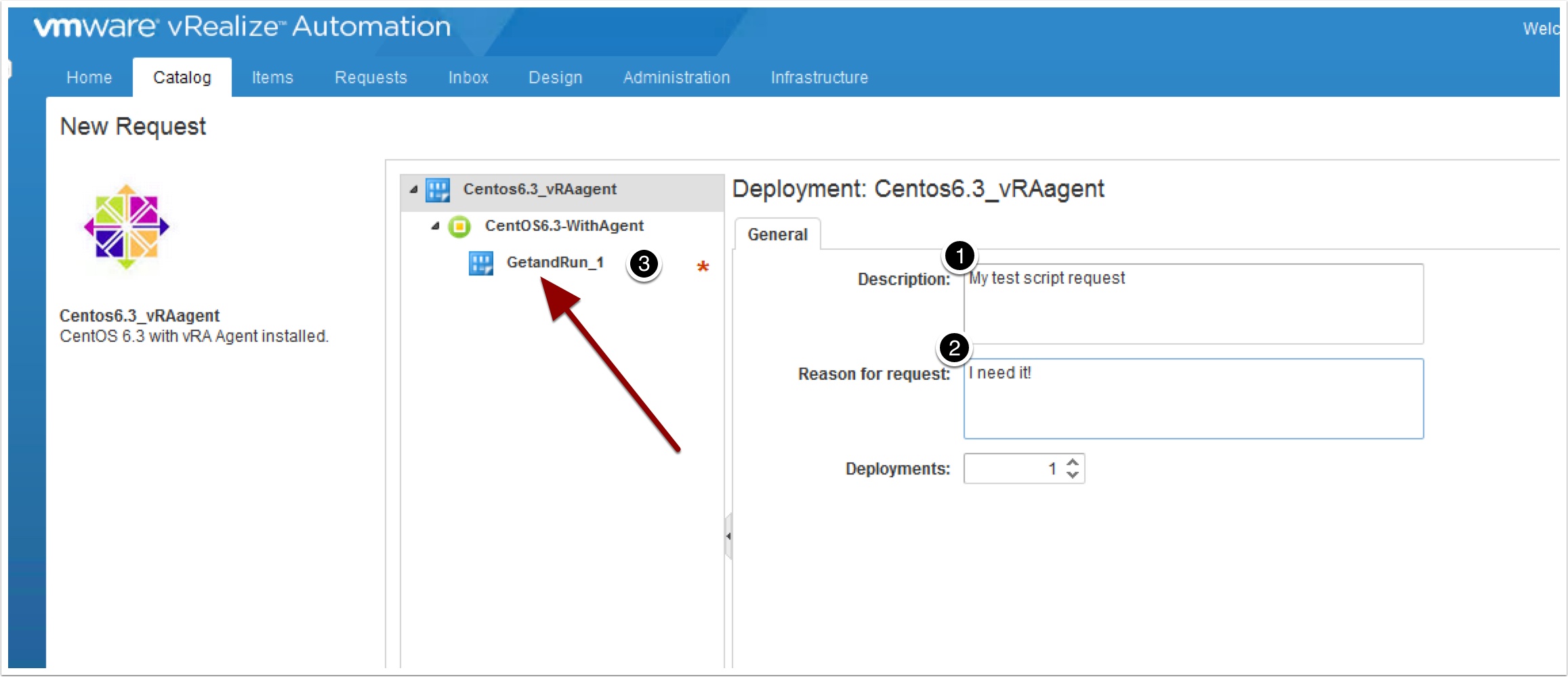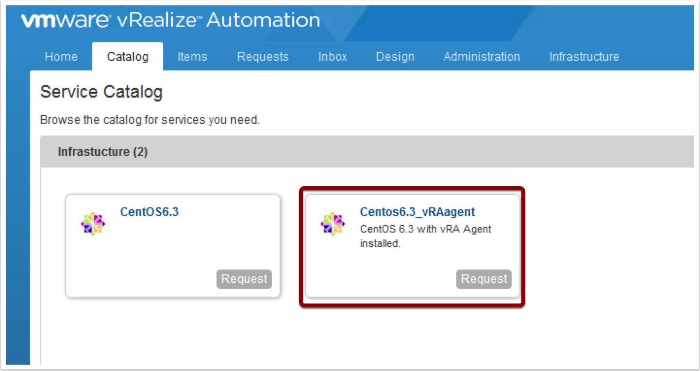 Now that we have the script on the HTTP server let’s fire off a new request. Before we test from the REST API let’s try this with the Portal UI just to see if we set everything up right. Click the Catalog tab then click the Centos6.3_vRAagent Blueprint