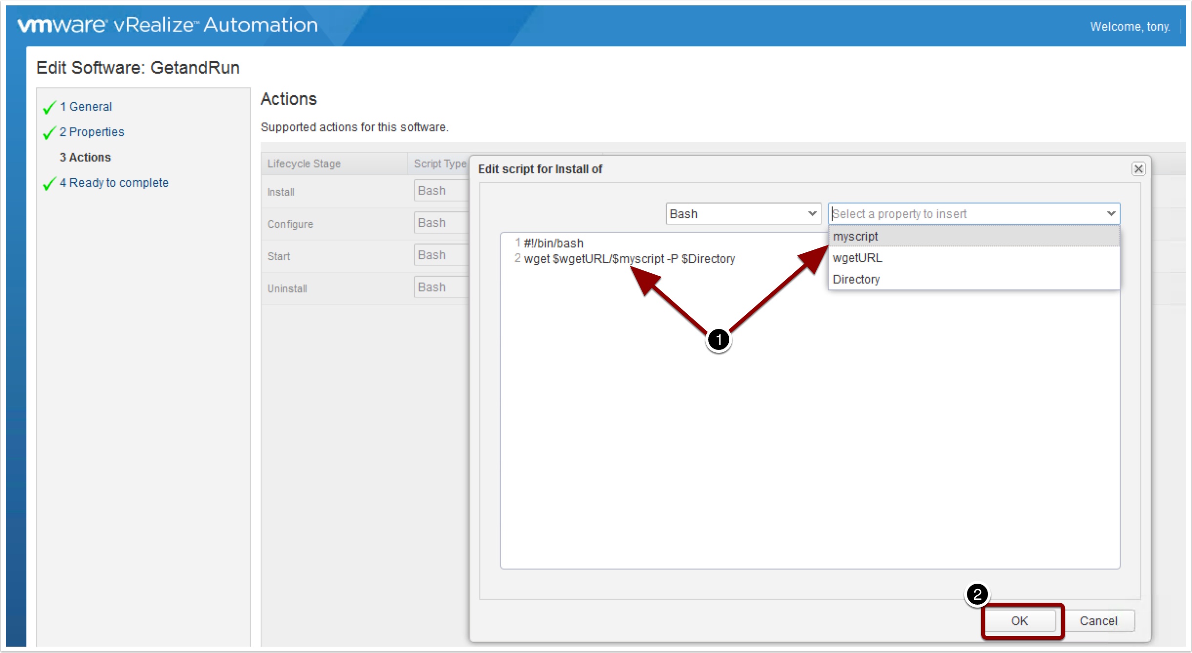Notice that in the script I am using the variables we created earlier. This are so that these are replaced with what the developer enters in at request time.