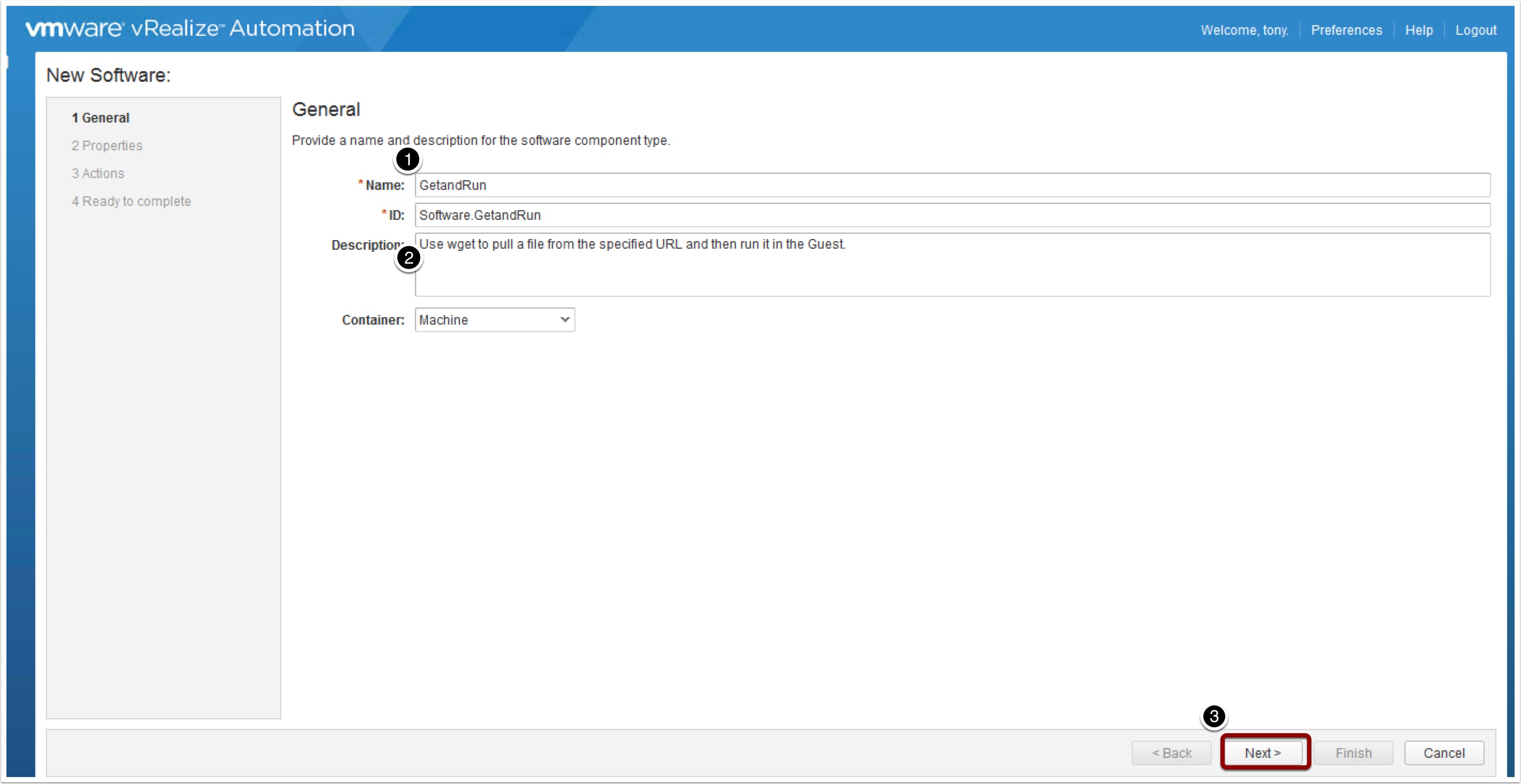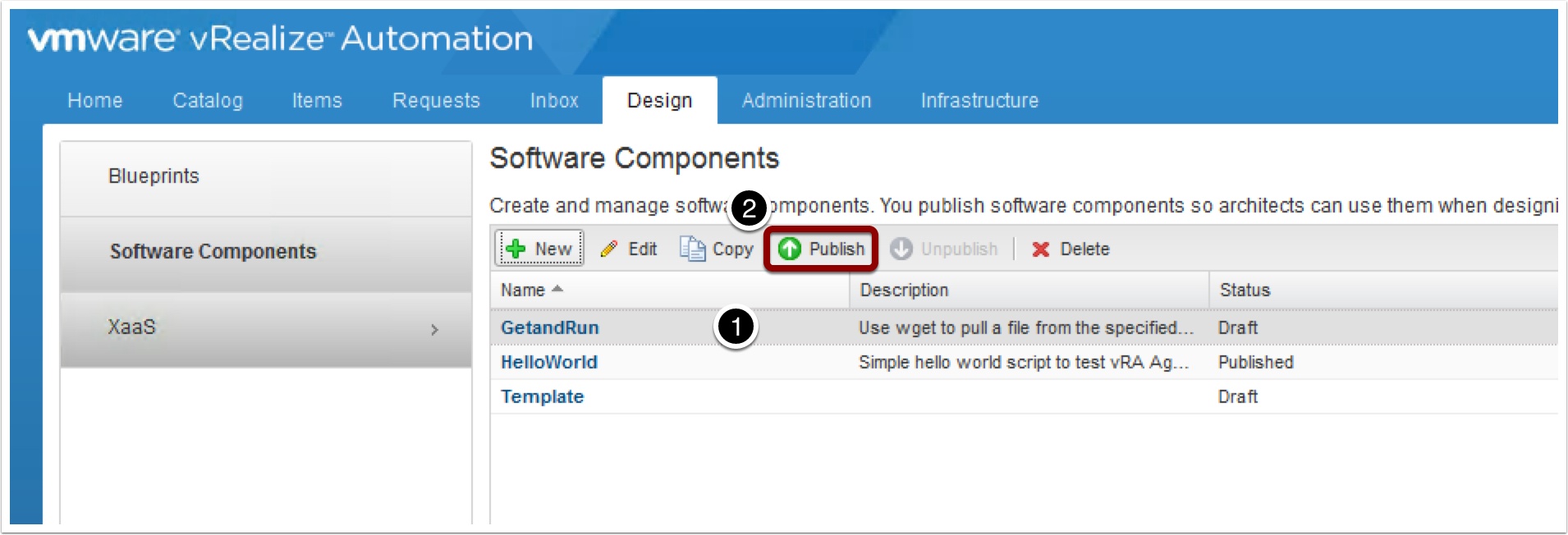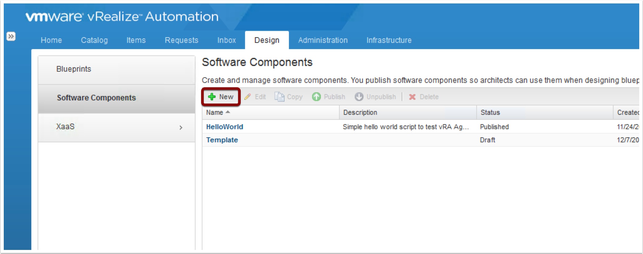If you have done the pre-req work we should already have a working Blueprint with the vRealize Automation Agent installed and tested. Now we will build onto that by creating a Software Component that will run commands in the guest VM at provisioning time so the developer can run whatever scripts they want as part of a REST API request. Login to vRA portal as a Cloud Admin. Then go to the Software Components Tab and click New.