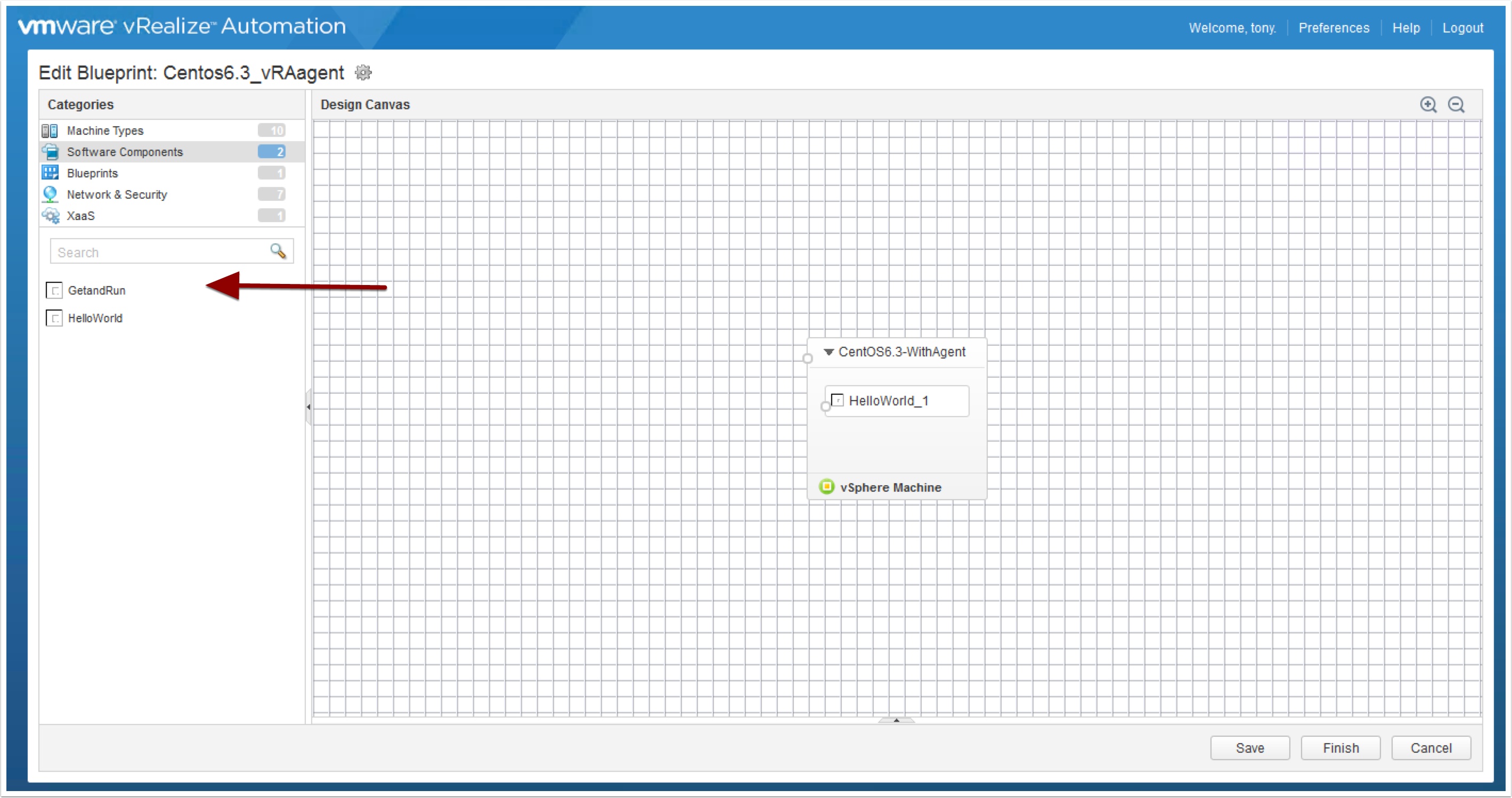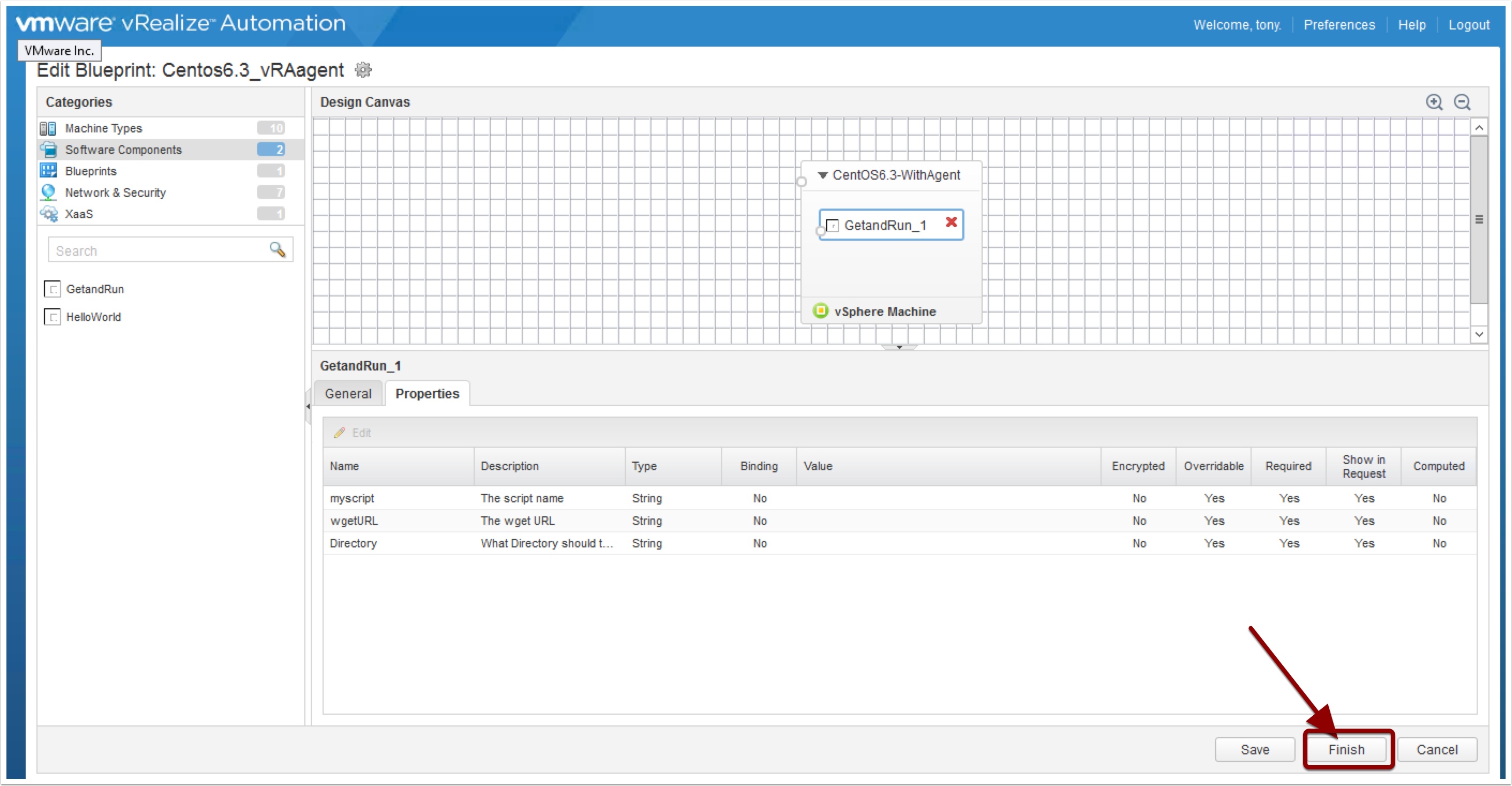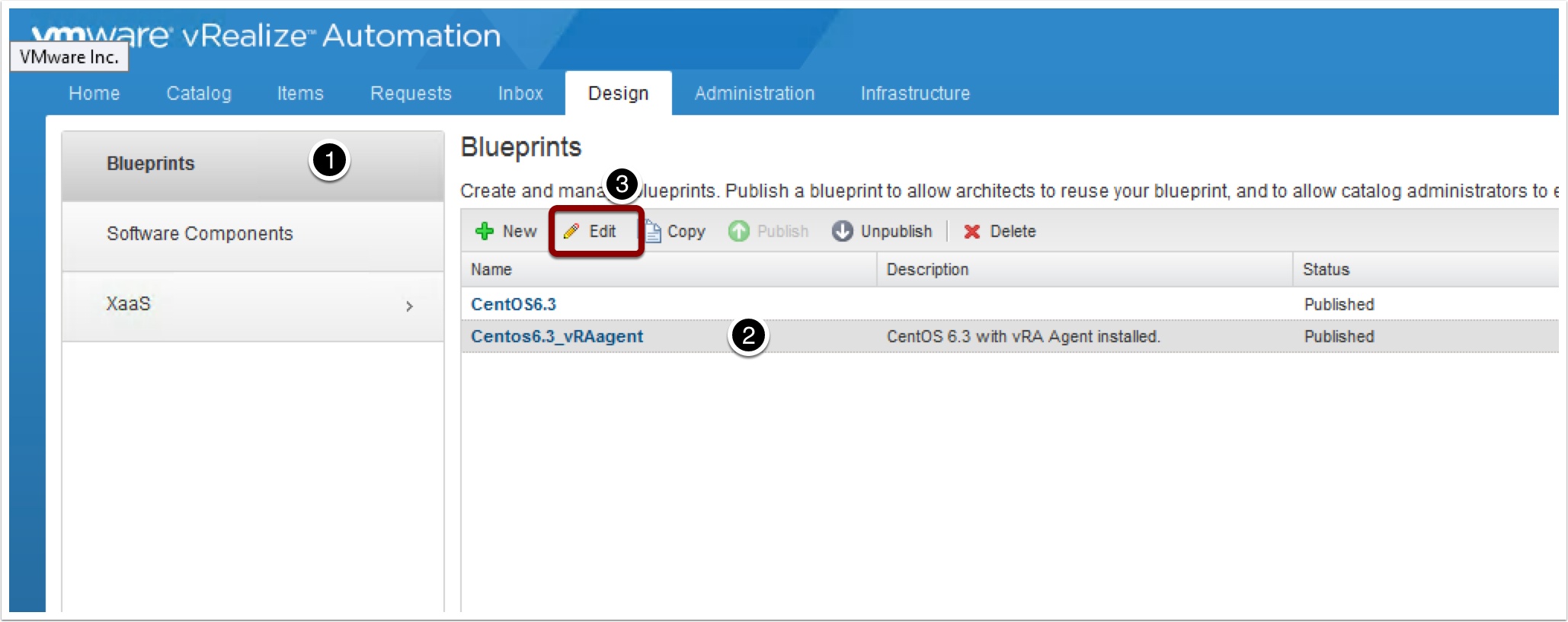 Now let’s add this software component to our blueprint, click the blueprints tab then highlight out Centos6.3_vRAagent blueprint and click edit
