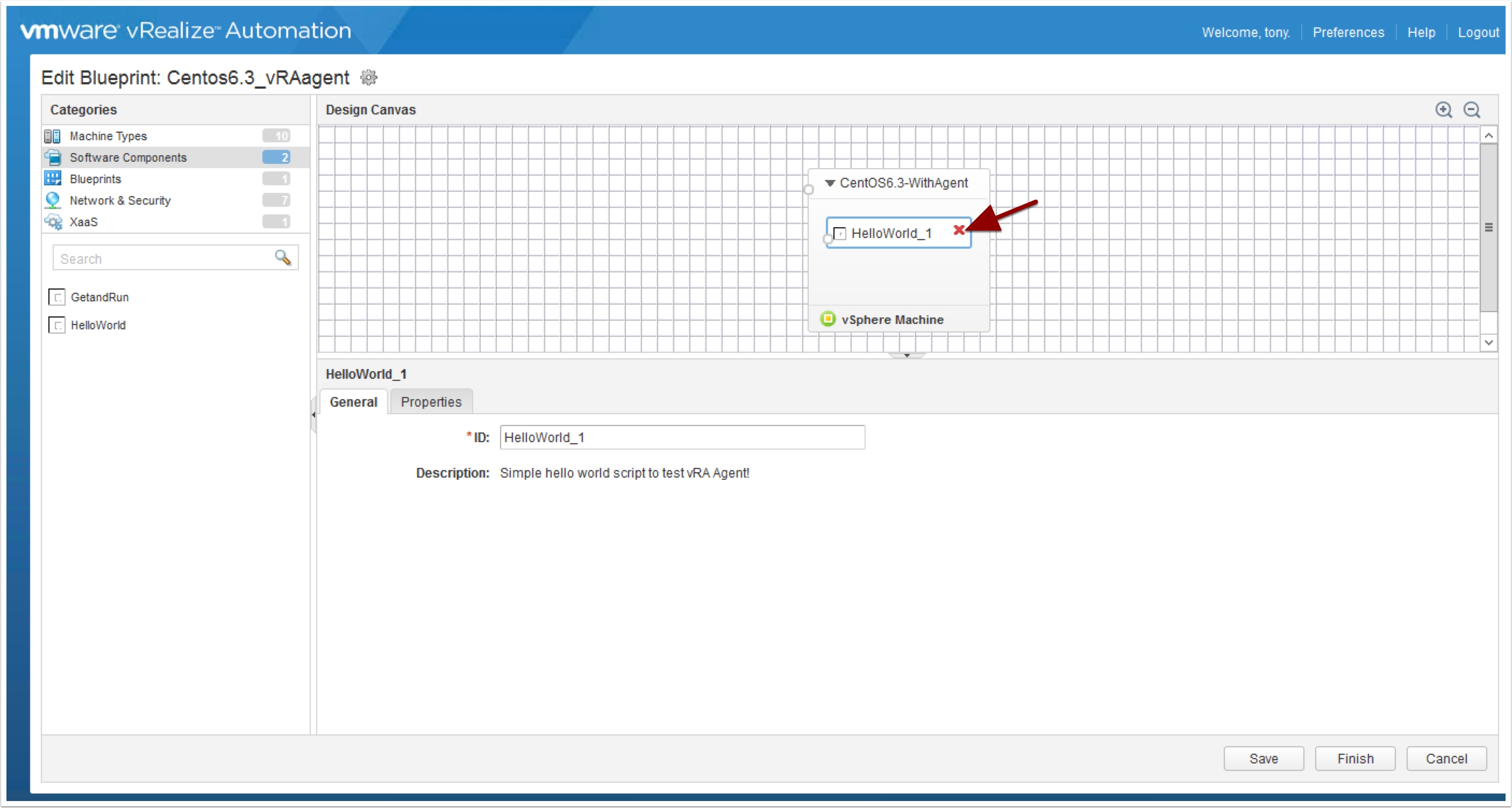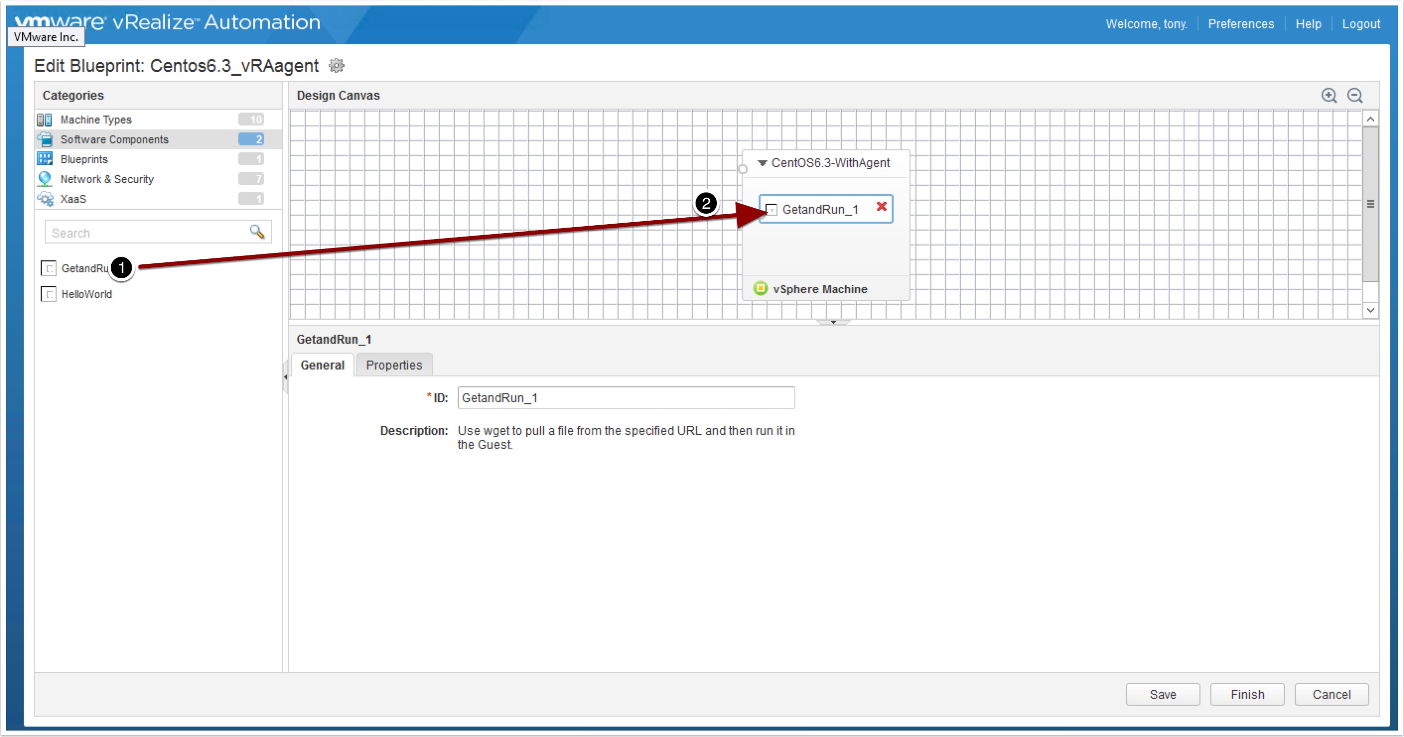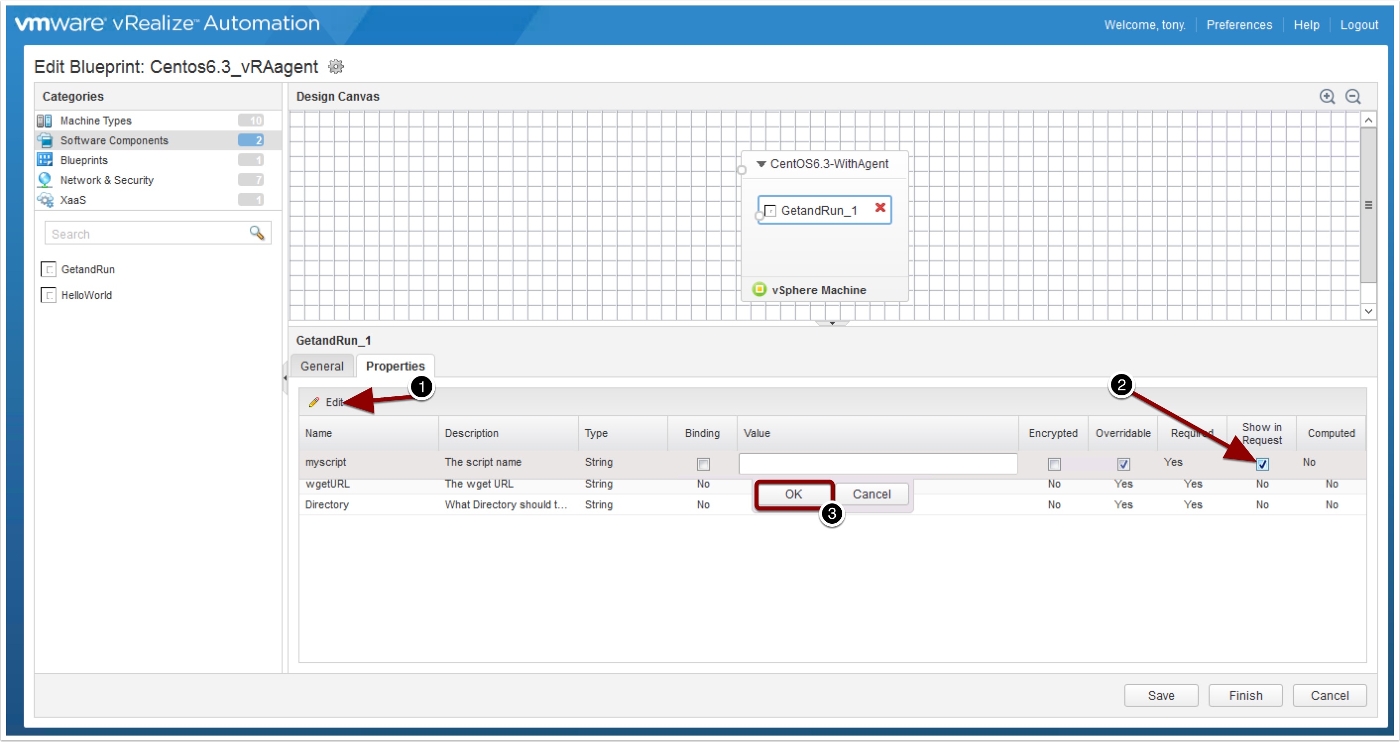 Now let’s add this software component to our blueprint, click the blueprints tab then highlight out Centos6.3_vRAagent blueprint and click edit